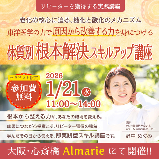 2026年1月は、東洋医学をもとに老化の原因にアプローチする知識を学ぶ“体質別根本解決スキルアップ講座”を開催します!